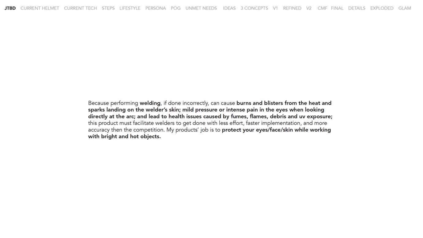 Considering a new method for design thinking, jobs-to-be-done, as well as social, economic, and technological factors, I designed a welding helmet that not only focuses on accessibility but also provides an additional safety feature.